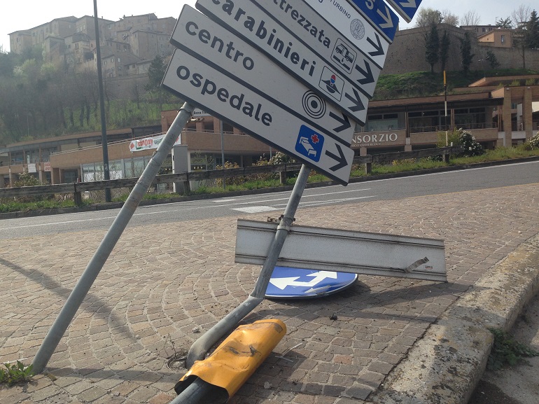 Il danno provocato dall’auto è stato già in parte riparato: l’Anas è intervenuta martedì mattina e ha rimesso in piedi una parte dell’insegna.