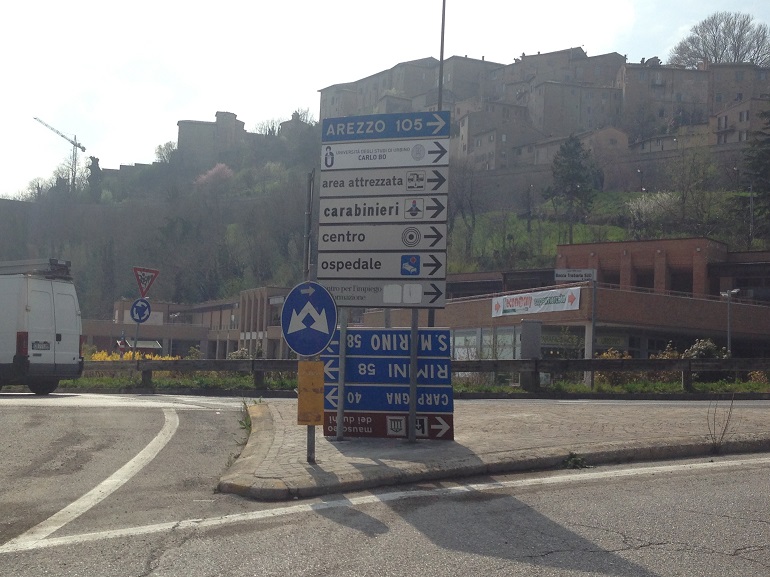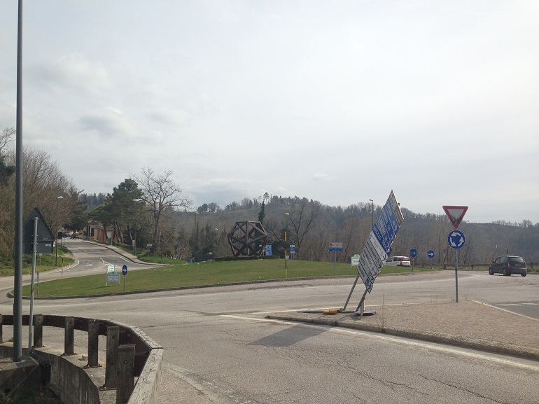 URBINO – L’unica certezza era che qualcuno lo aveva abbattuto in piena notte. I dipendenti del Consorzio e qualche passante lo avevano visto ancora in piedi intorno all’una della notte tra domenica e lunedì. Ma la mattina dopo il cartello in mezzo alla rotonda della Croce era piegato su un lato. Del responsabile, però, non c’era traccia. A risolvere il mistero è stato un testimone che abita in zona e ha assistito alla scena e ha contattato Il Ducato. Secondo il suo racconto ad abbattere l’insegna stradale è stata una macchina grigia, con a bordo due passeggeri. È successo verso l’una di notte di domenica 19 marzo.