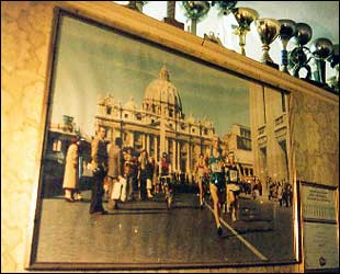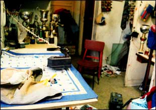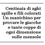 in una lunga falcata. Si vedono targhe, coppe alte, alcune dal collo lungo, altre più basse e con i manici larghi. Qualcuna è piccola, di colore argento, altre sono in ottone. Questo ingresso è un ambiente di passaggio. Dalla stanza adiacente proviene il suono di una radio. La sartoria è di là. Passata la soglia si entra in una camera piccola e piena di oggetti, separata dalla cucina da un muro sottile. Di fianco alla porta c’è la macchina da cucire, vecchia ma perfettamente funzionante. Contro la parete di fronte è appoggiato un tavolo da lavoro dalla base in legno. Sul tavolo c’è il ferro da stiro, mentre un po’ dovunque sono sparsi aghi e fili. Sui mobili e sulle mensole sono poggiate coppe e targhe senza un ordine preciso. |