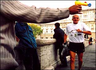 sottobraccio il fagotto con la giacca cucita e stirata e se ne va di corsa