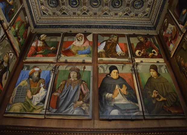 La visita, guidata dal professor Alessandro Marchi, specializzato in storia dell’arte medievale e moderna, si apre con Federico da Montefeltro con il figlio Guidobaldo bambino, un doppio ritratto di Pedro Berruguete, conservato alla Galleria Nazionale delle Marche, per presentare colui che ha voluto il magnifico palazzo “ideale”. Si pensava che questo quadro fosse tra le tavole dello Studiolo, ma lo spazio rimasto è troppo poco per ospitare anche quest’opera e si è quindi ipotizzato che fosse nella Biblioteca del duca. Rappresenta Federico all’apice del suo potere, appena ottenuto il titolo di duca. Ha infatti tutti gli attributi che simboleggiano questo stato: il mantello di ermellino e l’armatura, simbolo del suo essere un valoroso condottiero. L’artista però lo rappresenta anche nelle vesti di un uomo che occupava il tempo libero dalle battaglie per dedicarsi alla lettura. Proprio per questo motivo non ha nulla a coprirgli la testa; è quindi raffigurato nella situazione tra il pubblico e il privato.